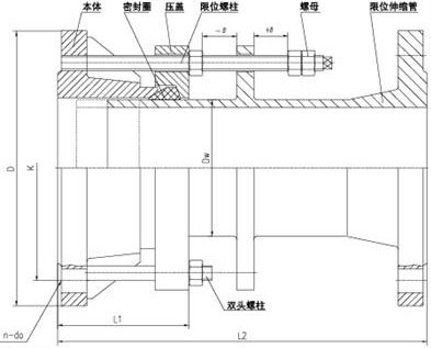 BF型单法兰松套限位伸缩接头,产品适用于输送海水、淡水、冷热水、饮用水、生活污水、原油、燃油、润滑油、成品油、空气、煤气、温度不高于250度的蒸汽和颗粒粉状等介质。 单法兰松套限位伸缩接头优点:安装方便快捷、密封可靠、维修方便。